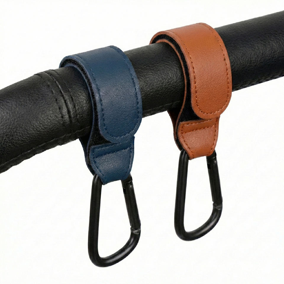 Gancho Ajustable de Doble Cara para Cochecito de Bebé con Mosquetón de Aluminio y Correa de Cuero PU