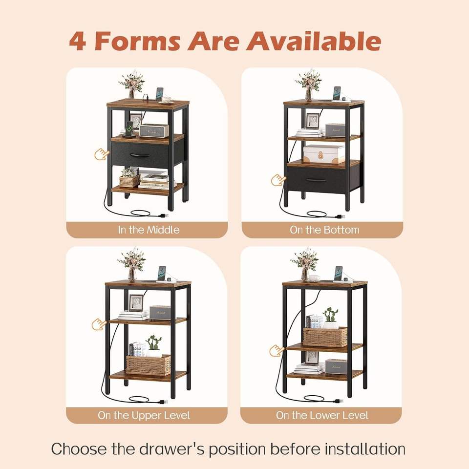 Mesa de Noche Ajustable con Cajón de Tela y Estación de Carga para Dormitorio