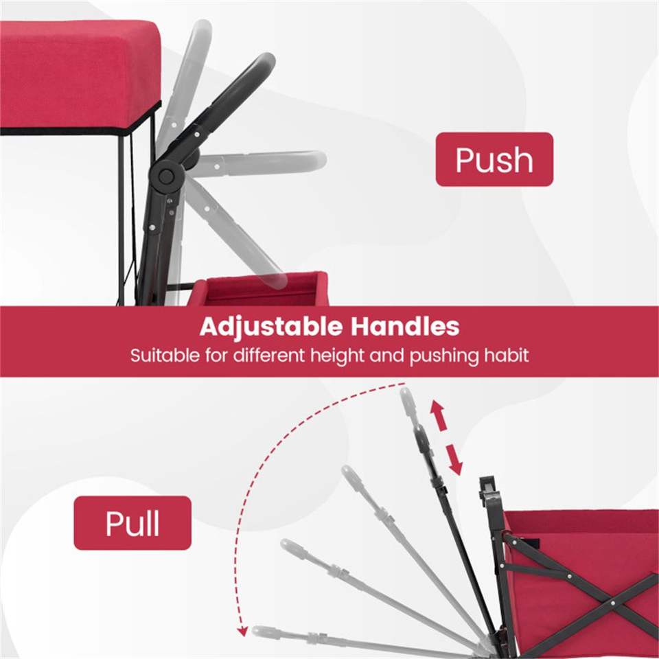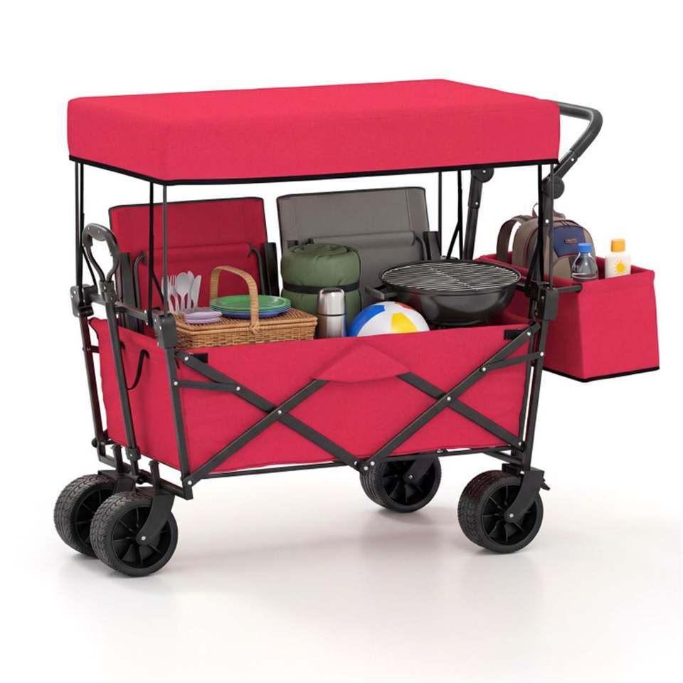 Carrito Plegable Rojo con Asa Ajustable, Ruedas Antipinchazos, Frenos y Bolsillos Laterales Extraíbles para Camping al Aire Libre