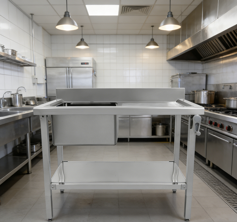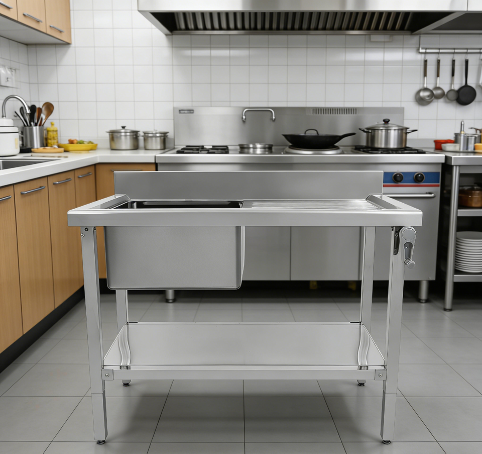 Mesa de Trabajo Ergonómica de Altura Ajustable con Estante Inferior y Fregadero para Cocina