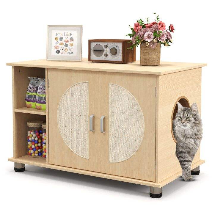 Caja de arena para gatos con patas metálicas ajustables, puertas rascadoras de sisal y accesorios