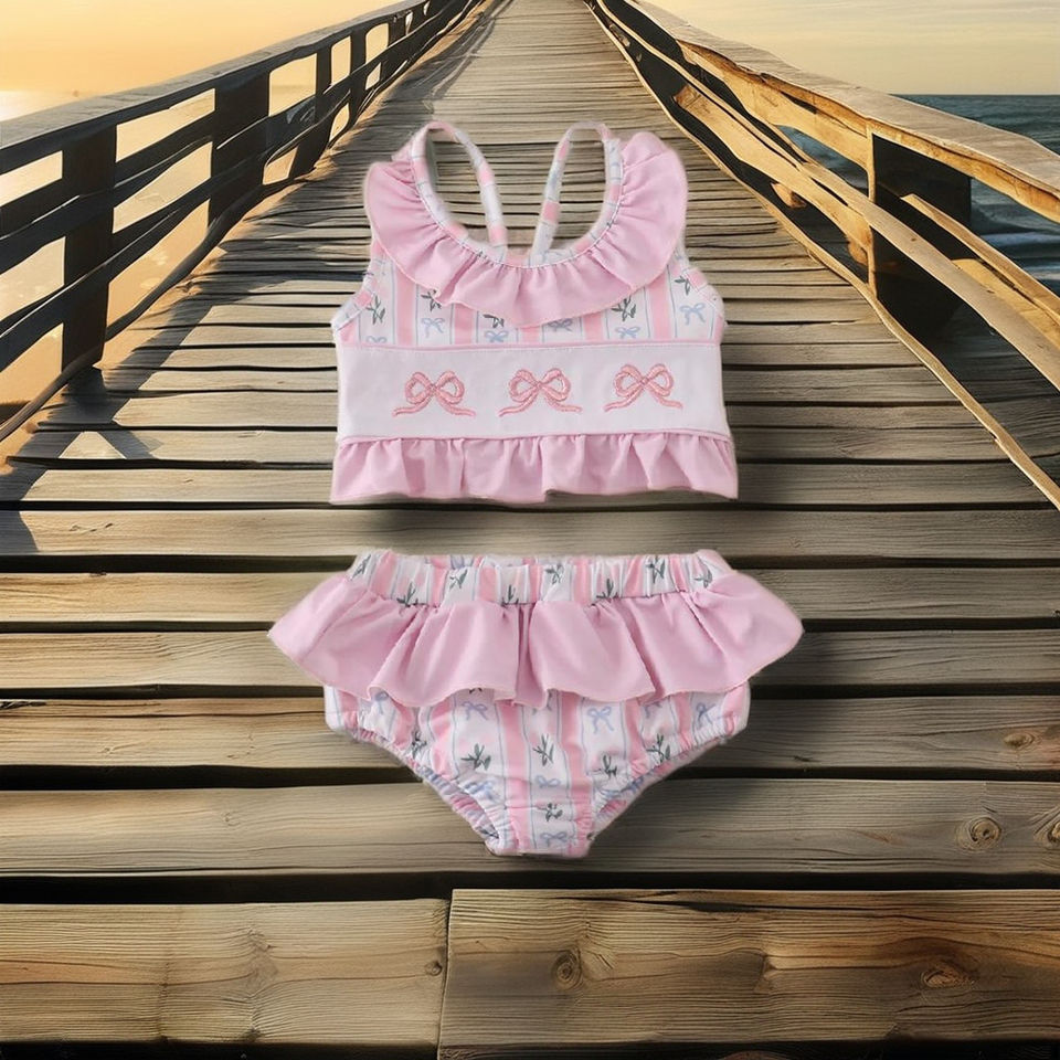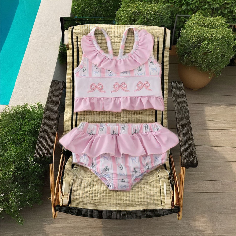 ¡Adorables vestidos rosas de dos piezas para niñas con traje de baño bordado con lazo para jugar en la piscina y la playa y divertirse!