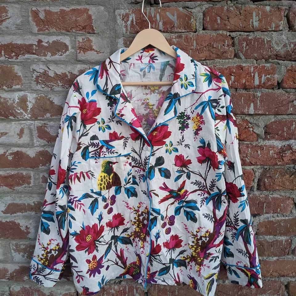Pijamas para Adultos con Estampado de Aves, Conjunto de Pijama de Algodón Puro, Ropa de Dormir Transpirable con Cierre de Cordón, Traje de Dormir para Todas las Estaciones
