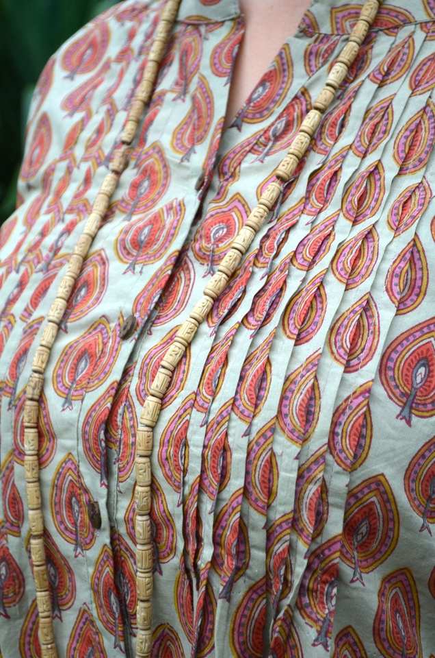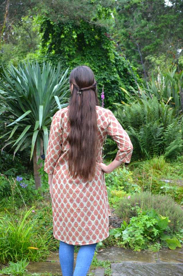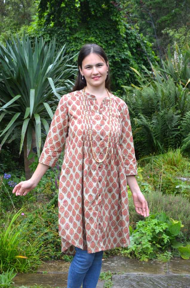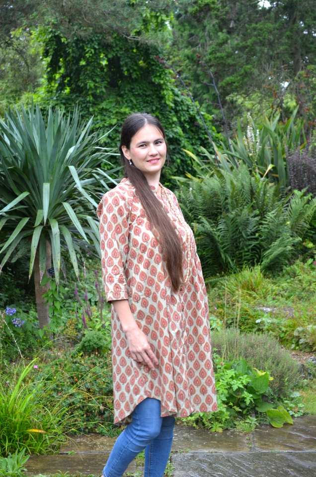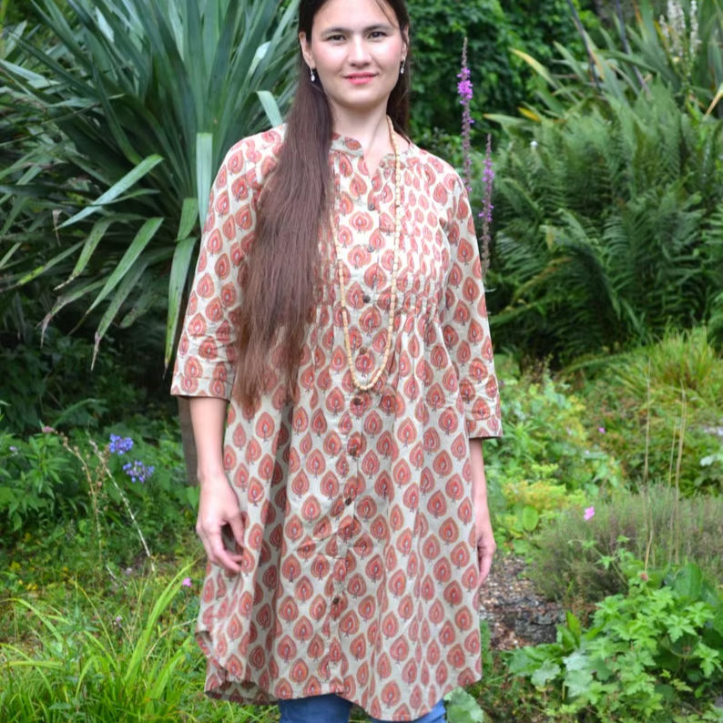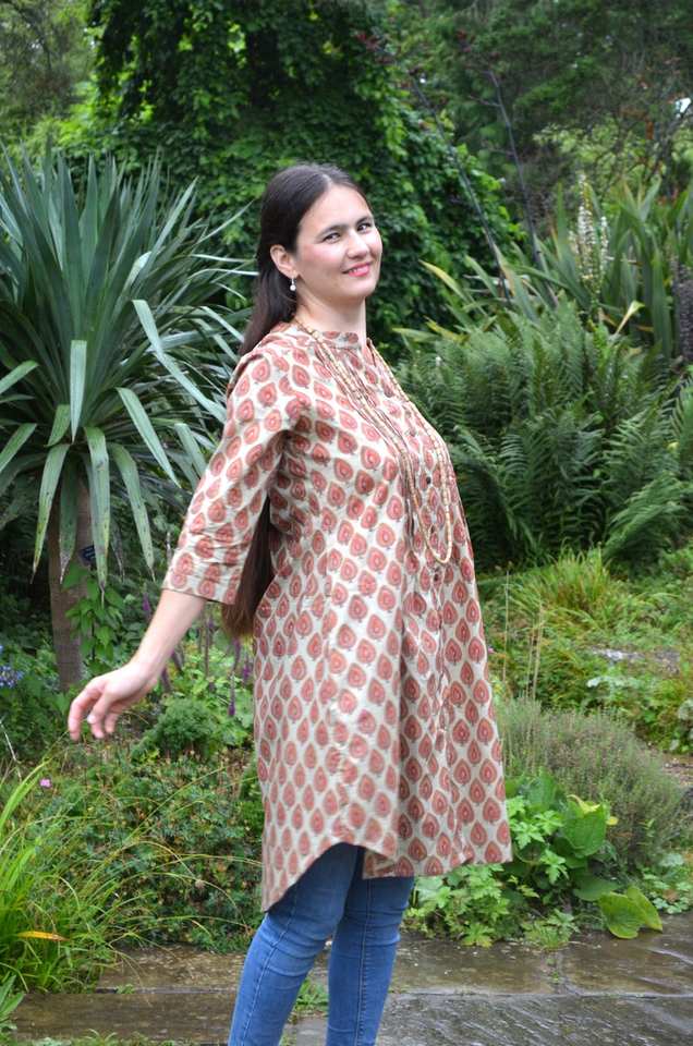 Vestido túnica Adya de algodón puro estampado a mano estilo bohemio | Estampado floral Rosa Beige | Traje ético hecho a mano Primavera Verano