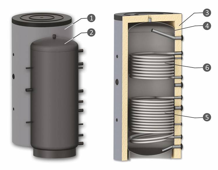 Los componentes principales.:Chaqueta de PVC estética con color RAL 9006, Aislamiento térmico altamente eficiente, Tanque de agua de acero de bajo carbono
