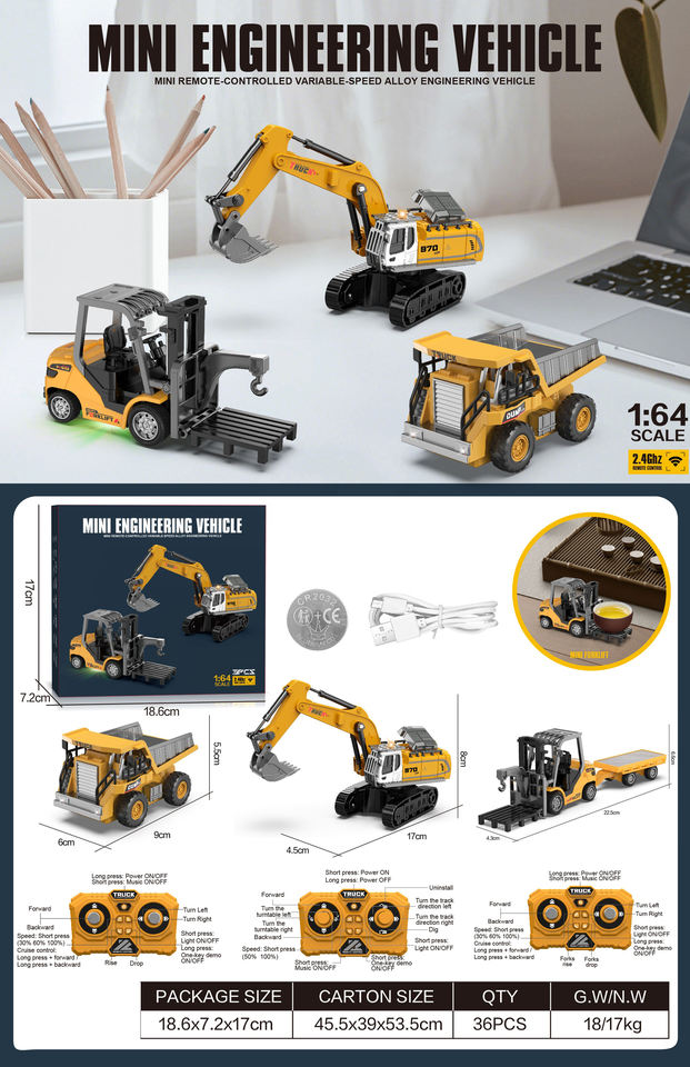 Nombre del Producto:Mini Excavadora RC 3 en 1 + Camión Volquete + Carretilla Elevadora + Palet