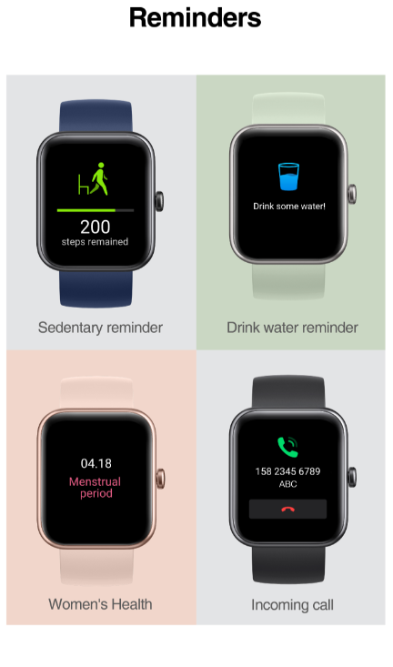 Reloj despertador, Recordatorio de llamada, seguimiento de forma, Monitor de ritmo cardíaco, Recordatorio de mensajes, Control remoto, Rastreador de sueño, Semana, Mes, Cuenta atrás, Calculadoras, PodómetroFunción