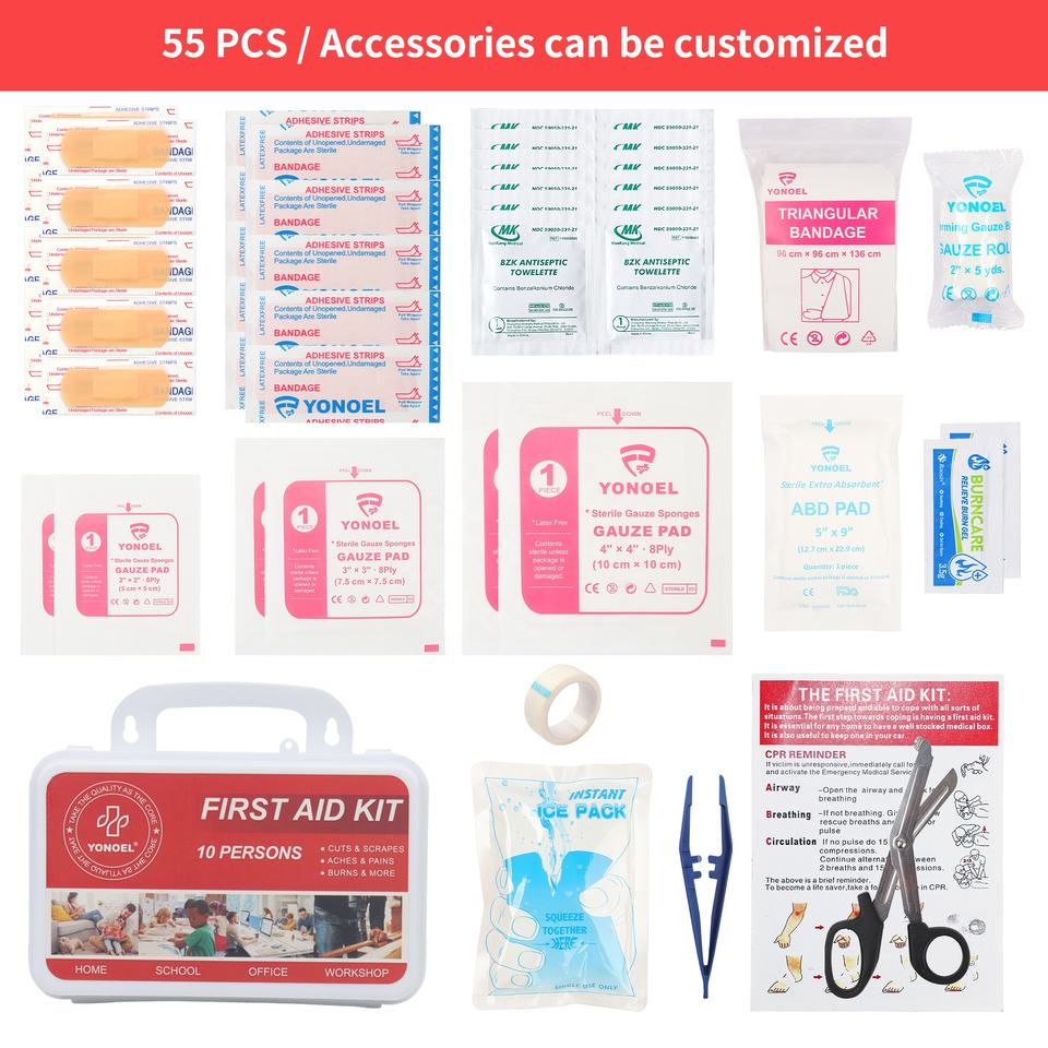 Botiquín de primeros auxilios de emergencia para 10 personas multiusos, juego de 55 piezas para el lugar de trabajo de negocios, suministros médicos y entrenamiento para el hogar y el coche