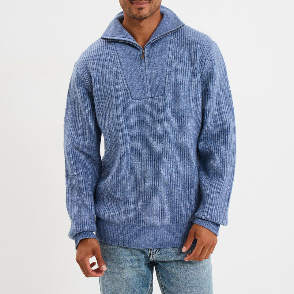 Nombre del Producto:Suéter azul oscuro de hombre con cuello trucker acanalado.