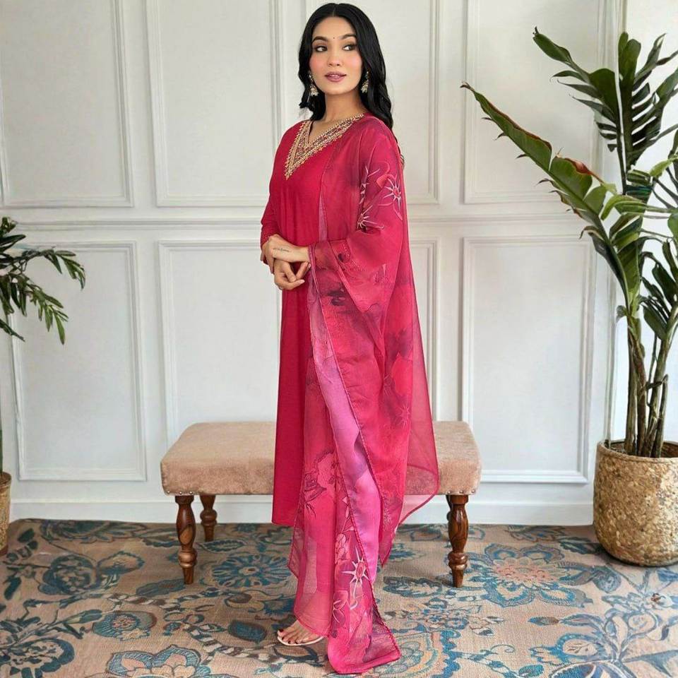Conjunto de Salwar Kameez de Diseño con Cuello en V, Corte Recto y Borde Decorativo, en un Hermoso Color, un Favorito de Siempre, con Dupatta Elegante para Mujer