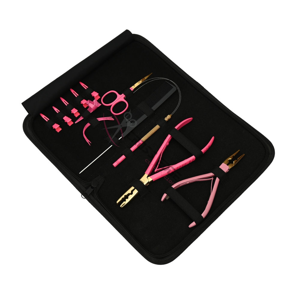 Ventaja:Juego de herramientas al por mayor para extensiones de cabello rosa con alicates rosas de 2 orificios