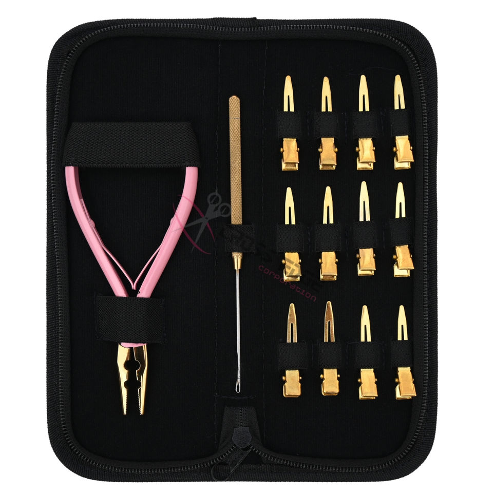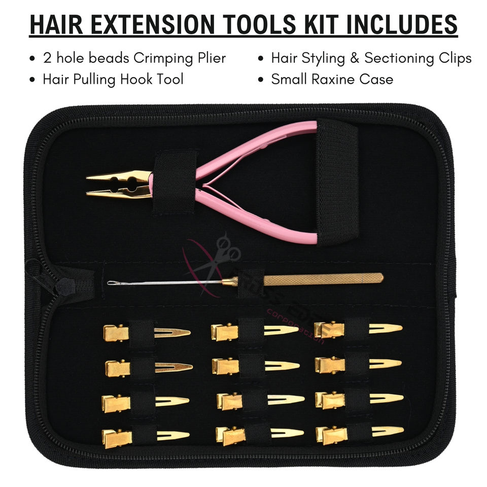 Juego de herramientas para extensiones de cabello todo en uno con alicate de crimpado de microperlas de 2 orificios, alicate tensor de anillos nano y estuche compacto para salón.