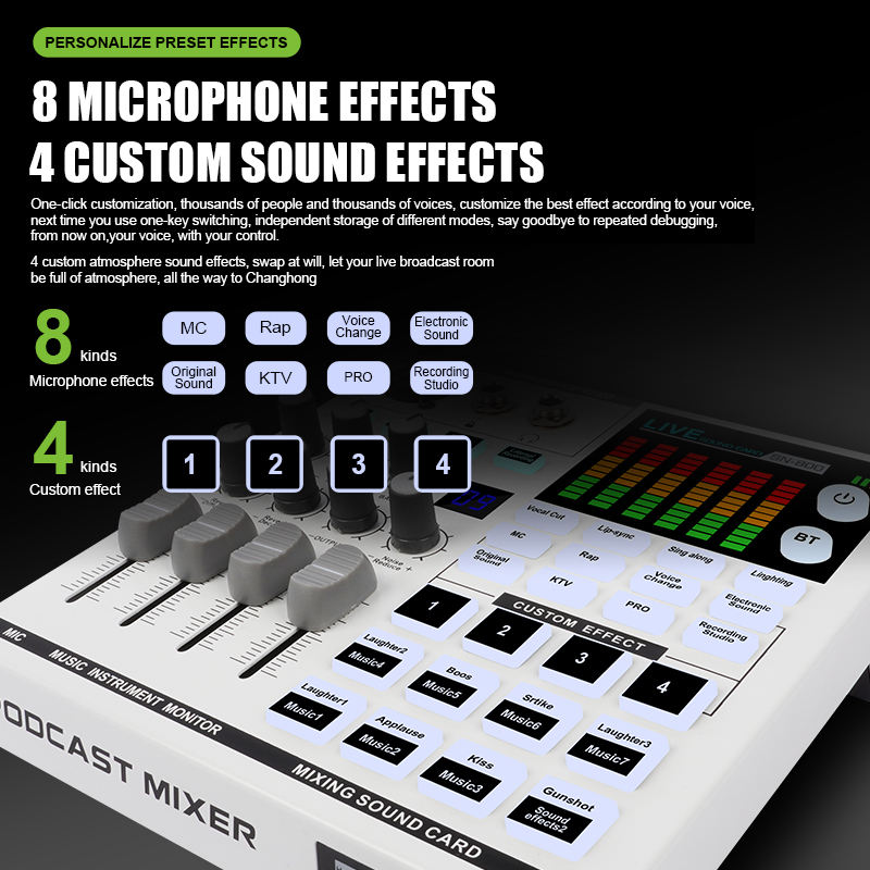 Múltiples sonidos electrónicos, Voz ajustable, Apoyo a dos personas streaming, Múltiples efectos de sonido, Cancelación de ruido, Soporte de conexión inalámbrica