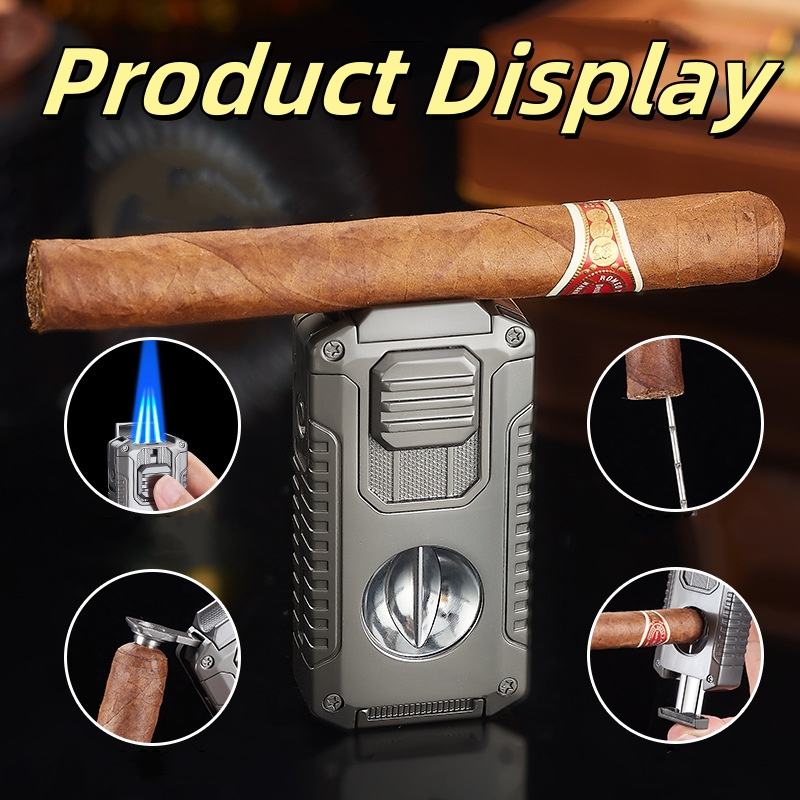 Encendedor de cigarros todo en uno con cortador de cigarros incorporado Corte en V, soporte para cigarros, encendedor de llama de chorro triple a prueba de viento con caja de regalo