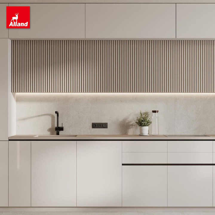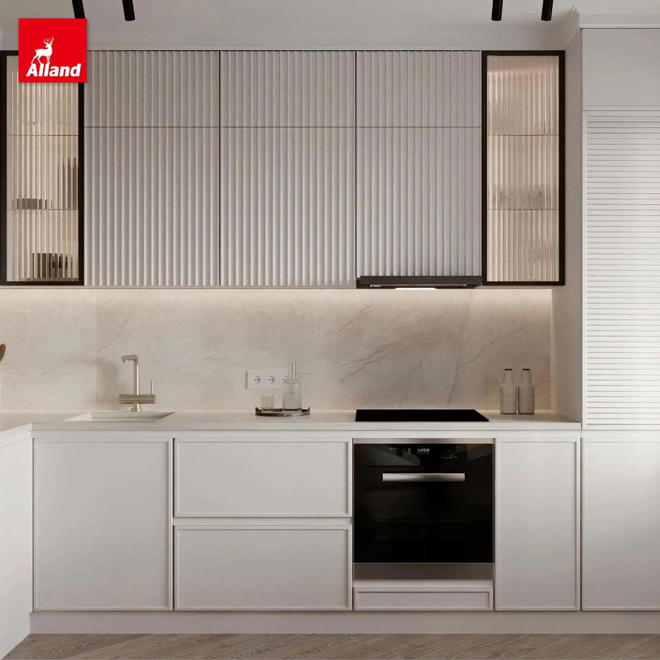 Juego Completo de Muebles de Cocina Modulares Alland, Gabinetes de Cocina de Madera Acanalados Blancos de Lujo, Resina para Espacios Pequeños, Almacenamiento para Grifo de Cocina