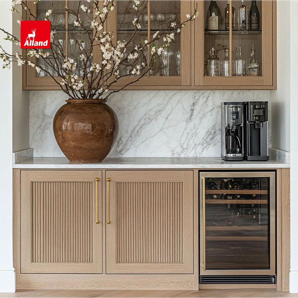 Gabinete de Cocina Empotrado con Marco de Roble Blanco y Nogal Alland, Estilo Moderno, Gabinete de Comedor con Diseño de Listones y Corte en Zigzag, con Servicio de Personalización
