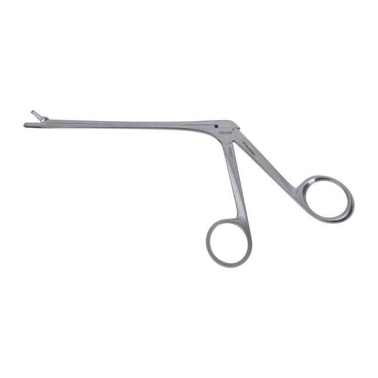 Material: Medical grade stainless steel, Type: Alligator forceps ENT surgical instrument, Design: Angled rigid shaft with alligator jaw and finger ring handle, Length: Approximately 17 cm, Usage: Reusable, Sterilization: Autoclave compatible, Application: ENT ear nose throat procedures, Finish: Smooth corrosion resistant surface, Category: Medical surgical instrument