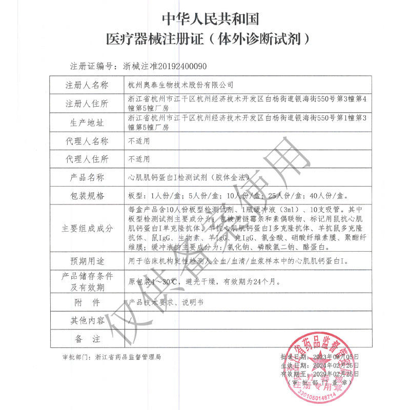 Certificado de Registro de Dispositivos Médicos de Zhejiang 20192400090Número de aprobación de medicamentos (dispositivos médicos)