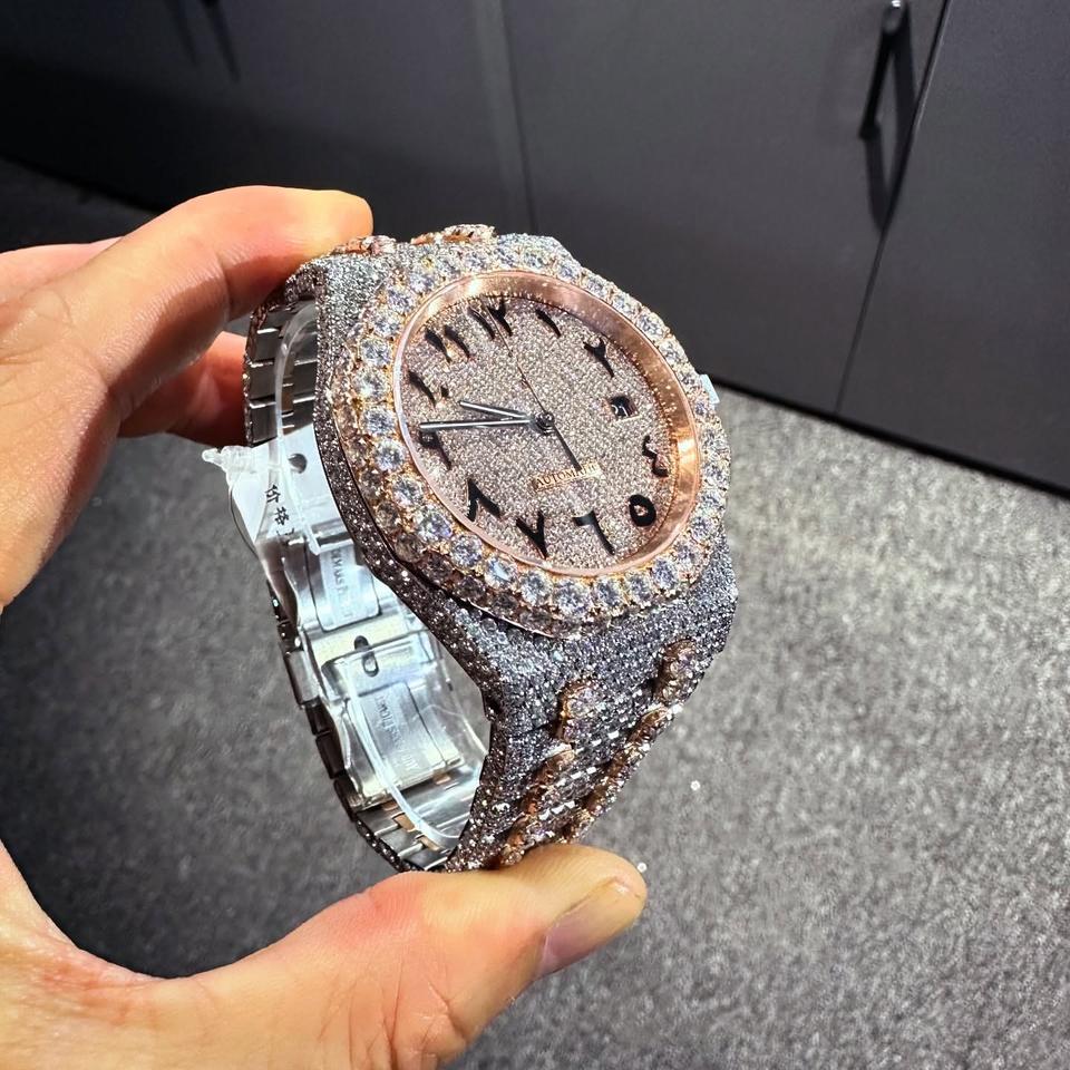 Seductor reloj automático antiguo de 41MM VVS Moissanite diamante completo para cuarzo de hielo 5mm vidrio amarillo oro banda de acero inoxidable rosa