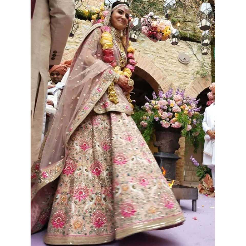 Lehenga Choli Nupcial De Seda Bordado Melocotón Seductor Con Dupatta