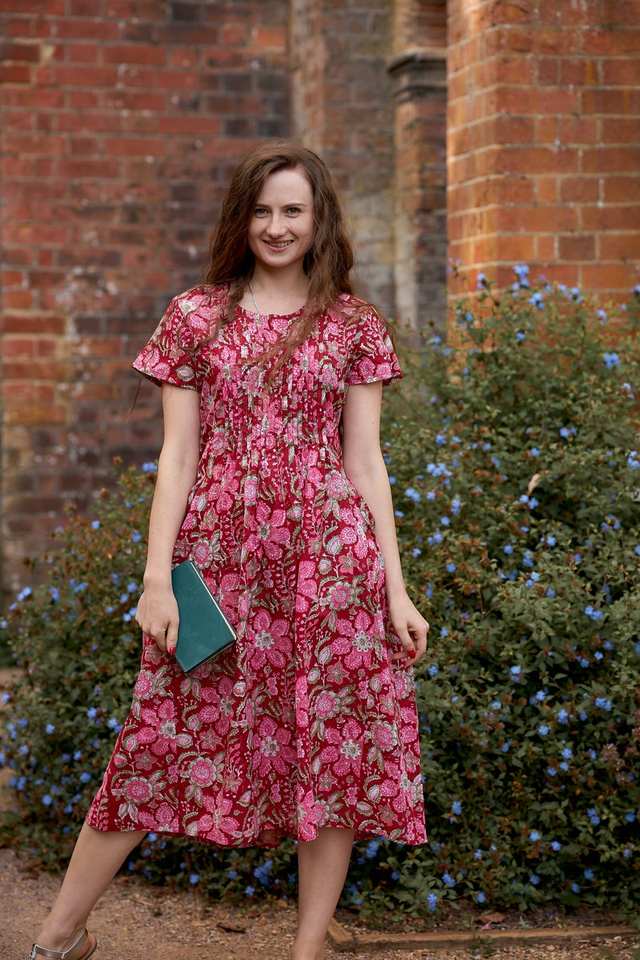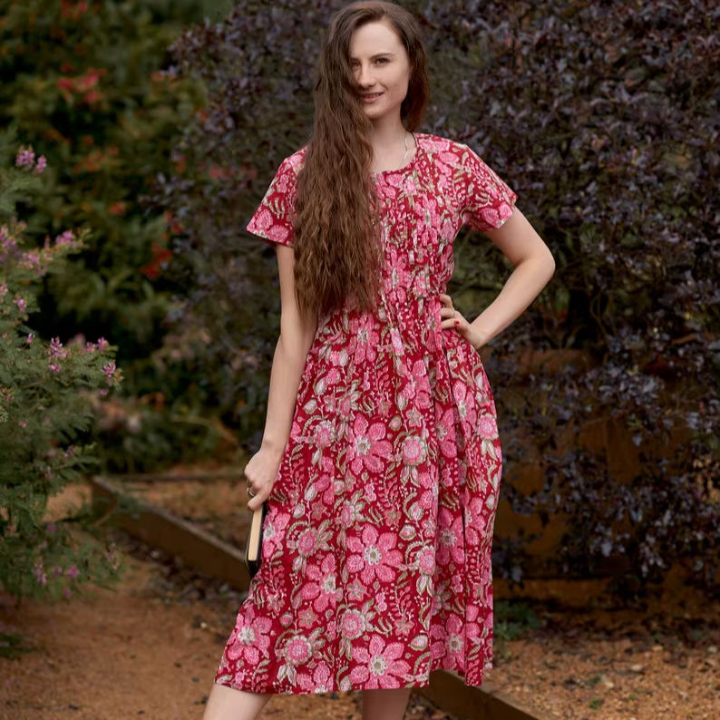 Vestido de Algodón Estampado a Mano Alohi, Floral Gris Rojo Rosa, Moda Ética