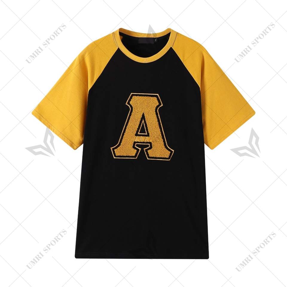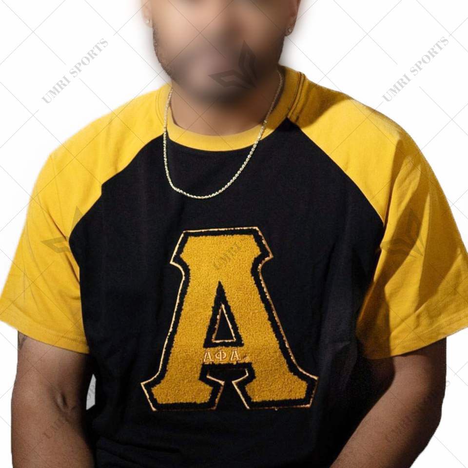 Alpha Big A Premium Raglan camiseta Alph @ camiseta griega camiseta con diseño personalizado Chenille bordado logo negro y oro viejo