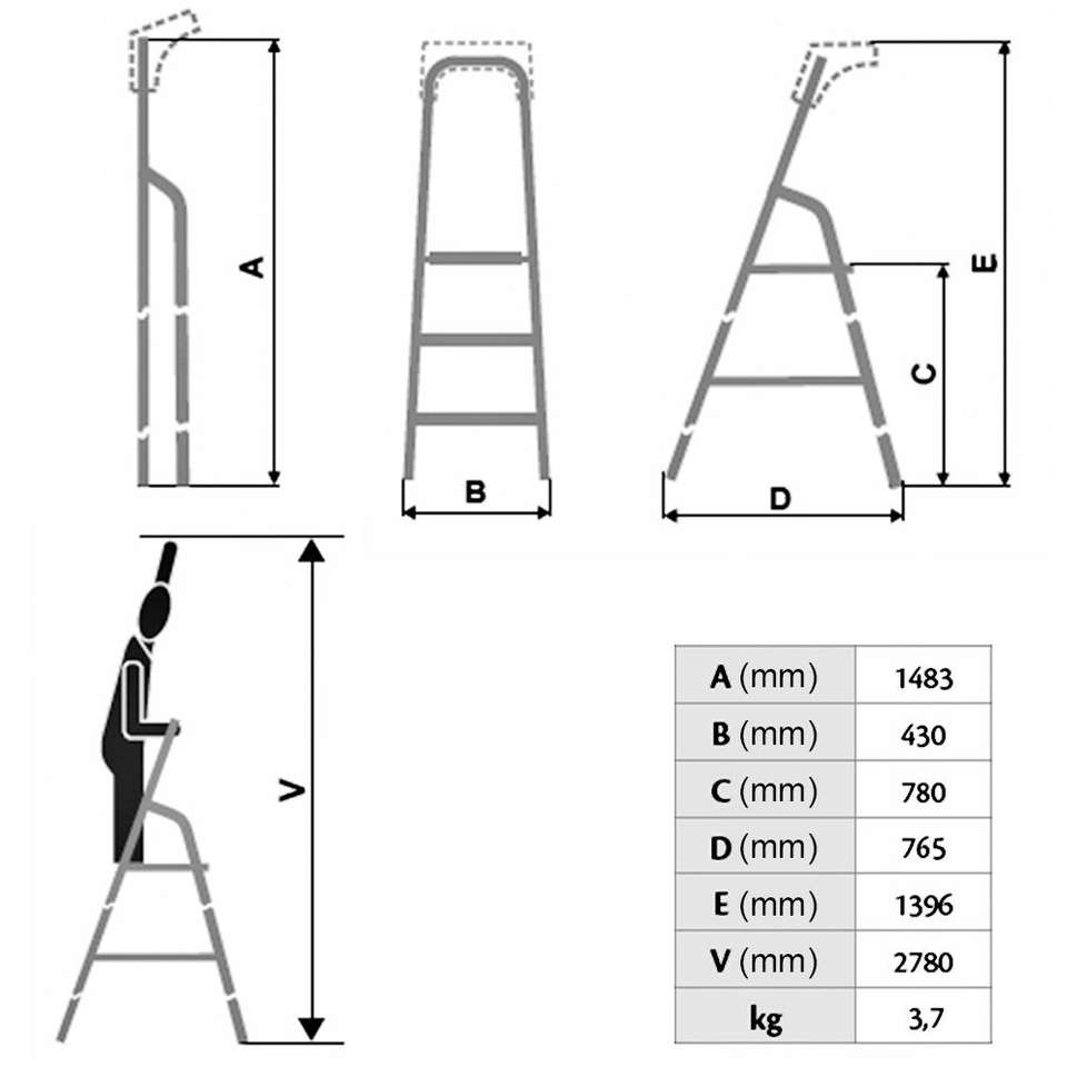 Alu-Stufenleiter Mit 4 Stufen, Obere Ablage Mit Eimerhaken, Max. Erreichbare Arbeitshöhe 2780 mm