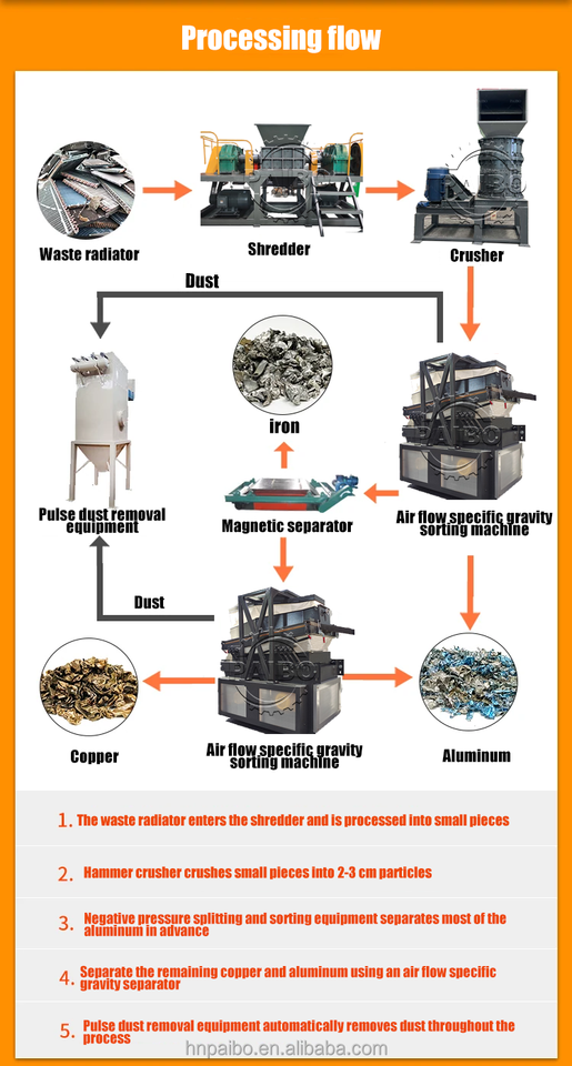 Uso:Reciclaje del radiador, Máquina de reciclaje de trituradora de radiador de aluminio de cobre, Planta de cobre radiador reciclador radiador de reciclaje