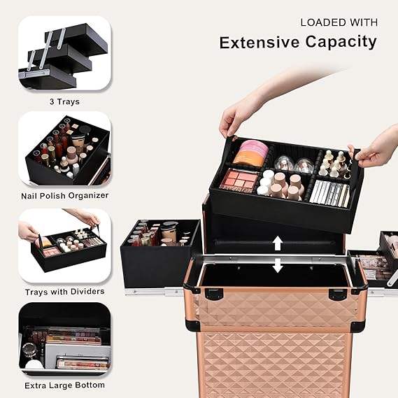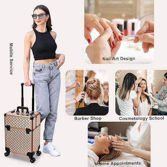 Maleta de Maquillaje Rodante de Aluminio con Rieles Deslizantes, Capa Central Extraíble, Cerradura, Ruedas Giratorias, Impermeable