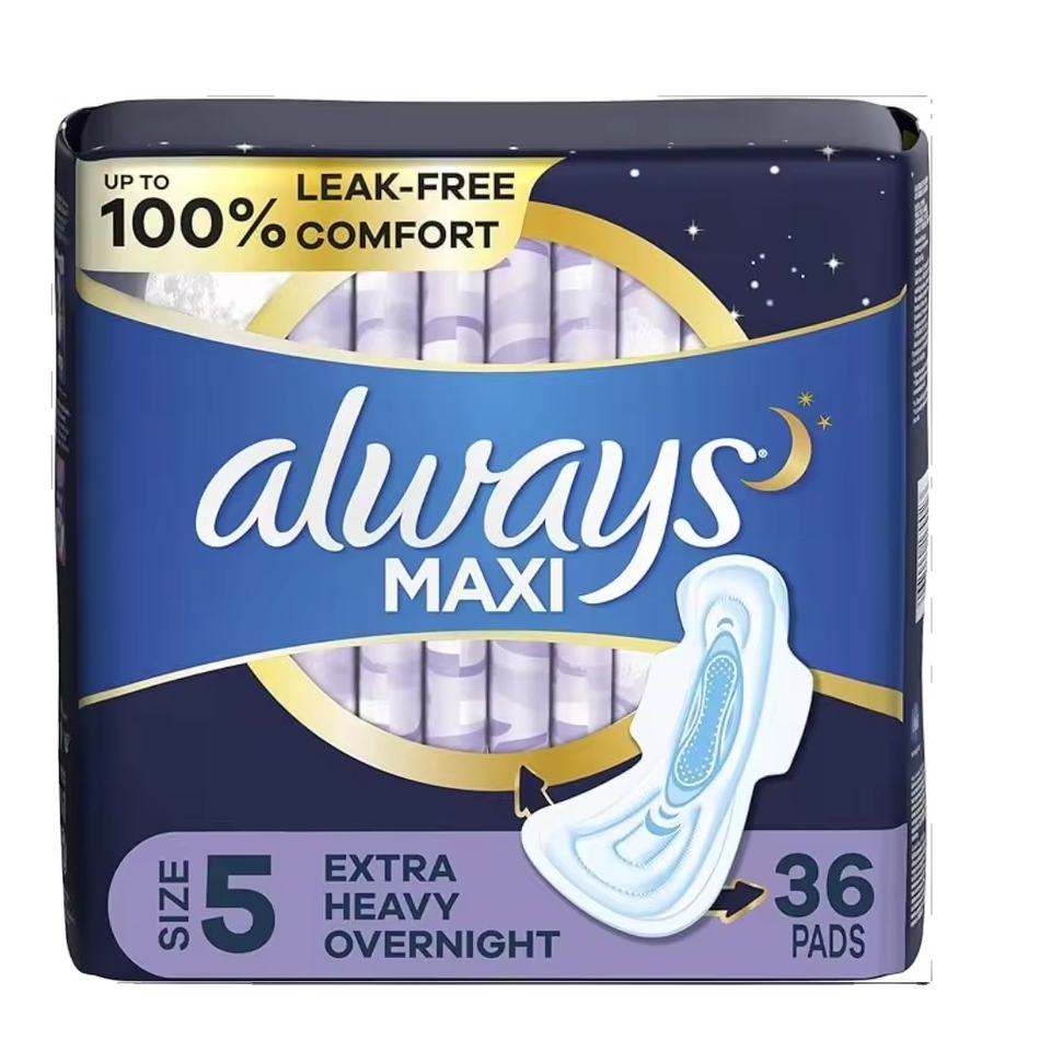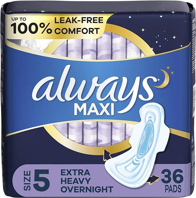 Always Maxi Feminine Pads para mujer, tamaño 5 Absorbencia nocturna extra pesada, con alas, sin perfume, 36 unidades