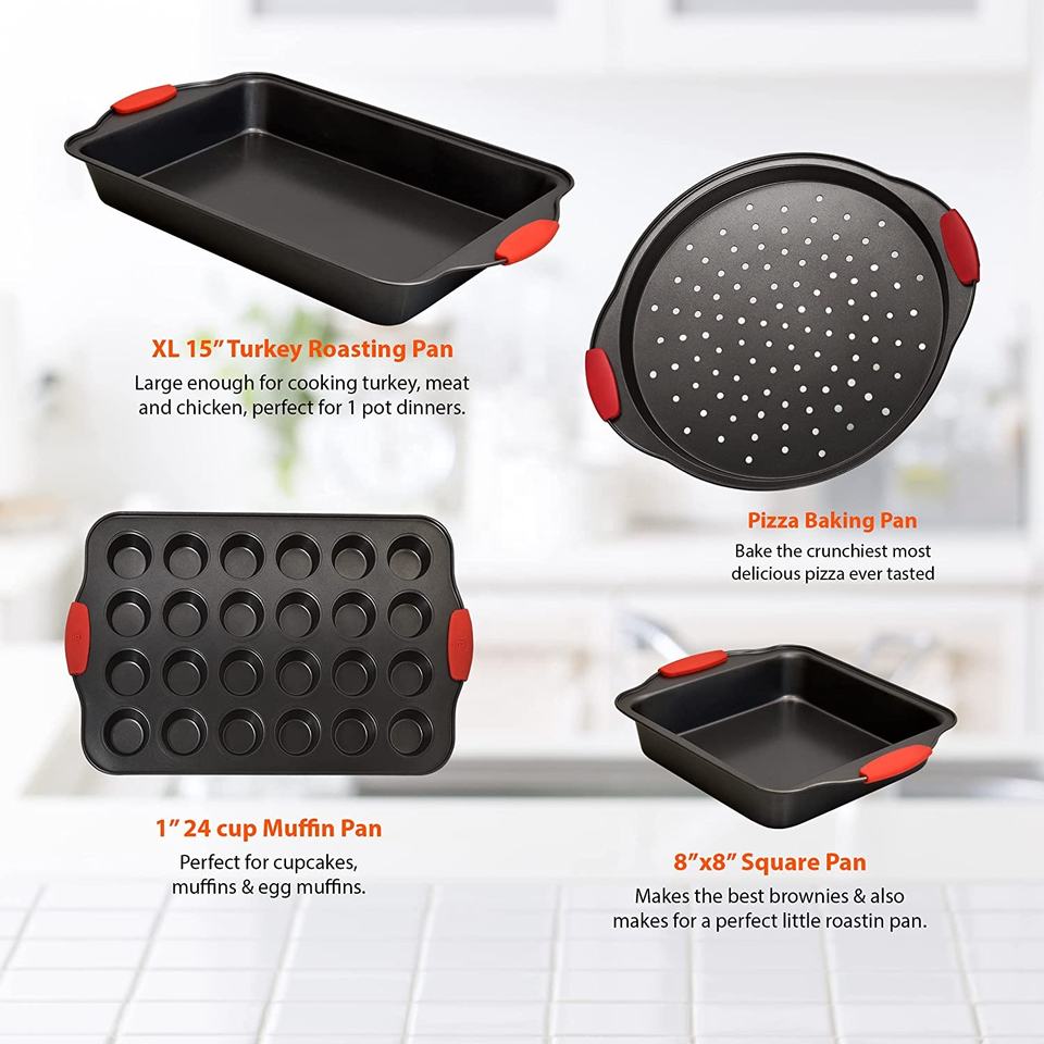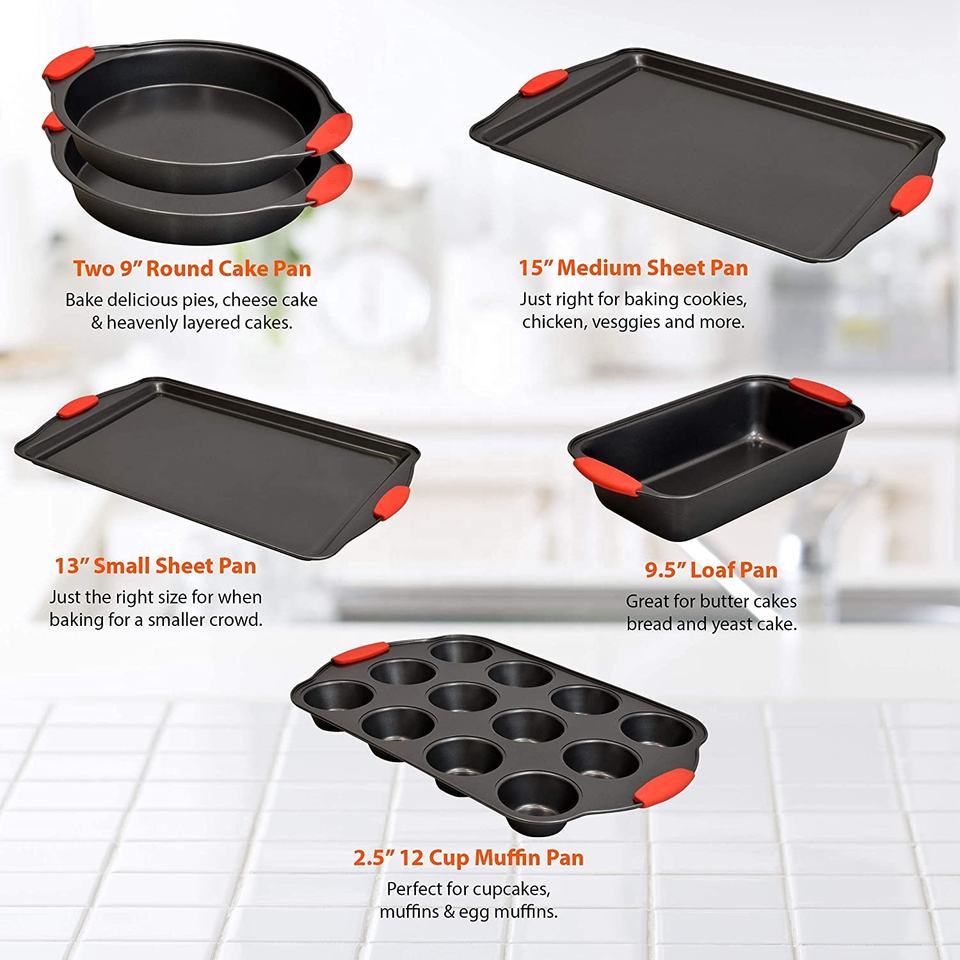Amazon Hot Sale juego de 10 piezas de utensilios para hornear con mangos de silicona: bandeja para hornear, plancha para horno, molde para muffins, bandeja para pizza