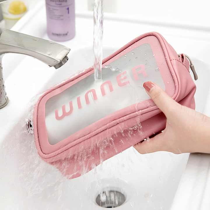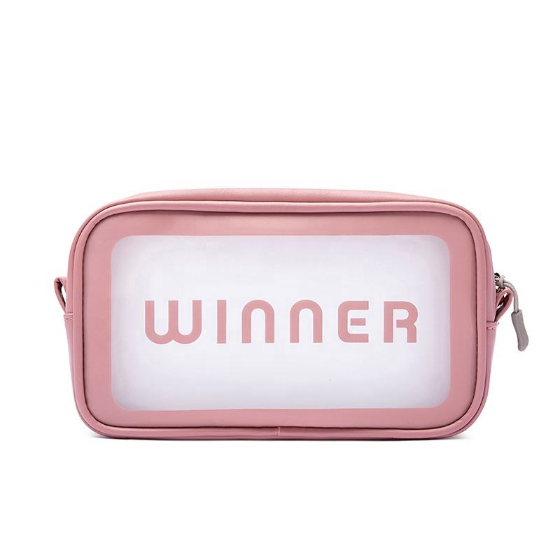 Bolsa de maquillaje transparente rosa de etiqueta privada de Venta caliente bolsa de cosméticos transparente de Pu de viaje