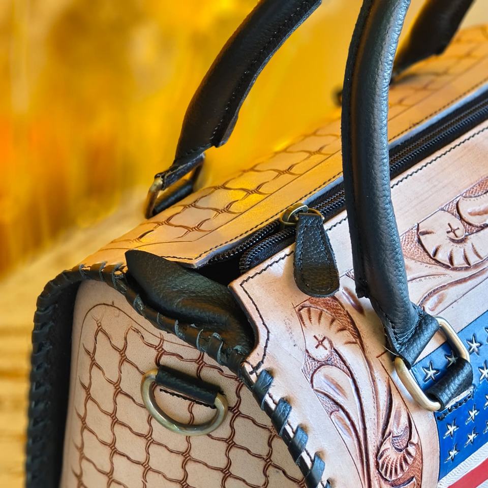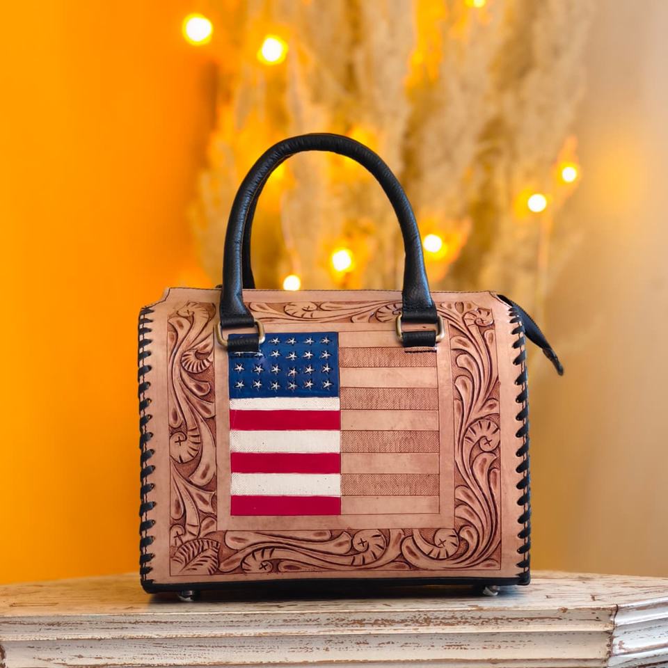 Bolso de Viaje Mini Speedy de Cuero Genuino con Patrón de Bandera Americana en Relieve, Diseño Floral Tallado y 2 Asas Dobles para Llevar