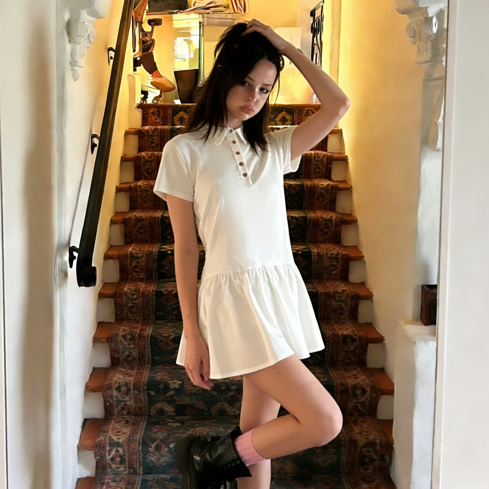 Vestido Americano Estilo Preppy con Cuello Polo, Botones Frontales, Diseño de Parches, Cintura Ajustada, Falda Plisada de Color Sólido