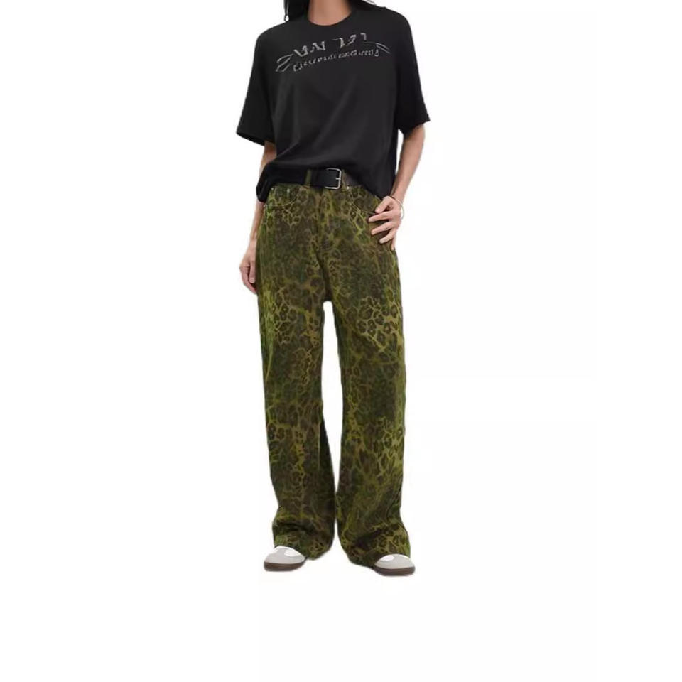 Pantalones vaqueros con estampado de leopardo de estilo retro americano ajustados rectos a sueltos pantalones de pierna ancha informales de grosor medio