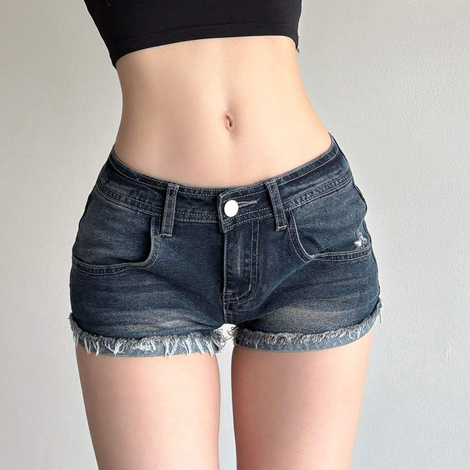 Shorts Vaqueros de Tiro Bajo Estilo Americano, Vintage, Deslavados, con Dobladillo Deshilachado, Ajustados, Sexys, para Verano