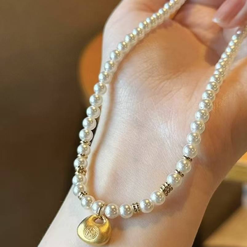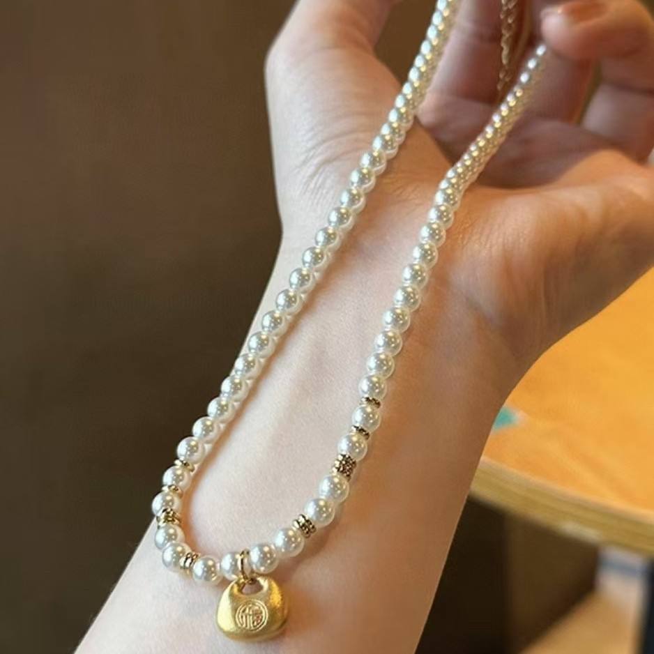 Bolsa de la Suerte Dorada de Estilo Antiguo, Cadena de Clavícula con Perlas de Cristal de Estilo Nacional Retro Chino, Cadena de Cuerpo con Perlas de Moda para Mujer