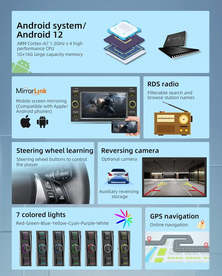 Visor de imágenes, Control del Volante, Sintonizador Radio, Android auto, MultiMedia apoya, Pantalla táctil, Compatible con Bluetooth, 3D mapa, En directo/aparcamiento, CarPlay, Cámara de copia de seguridad, Invertir la ayuda, Enlace espejo, MP3/MP4, Cargador de coche, De modo Dual, sistema de navegaciónFunción