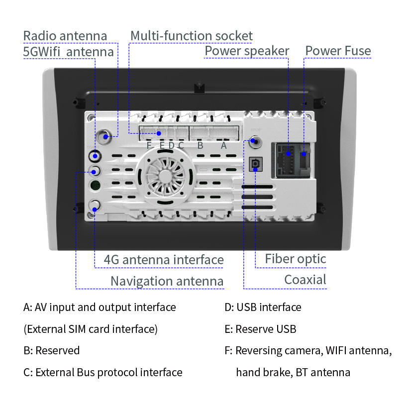 Construido en WiFi, Usb, Invertir, antena GPS, cable de audio y vídeo, Tarjeta SIM integrada/externa, antena 4G, Altavoz de potencia, Antena de radio, Antena BT/WIFI