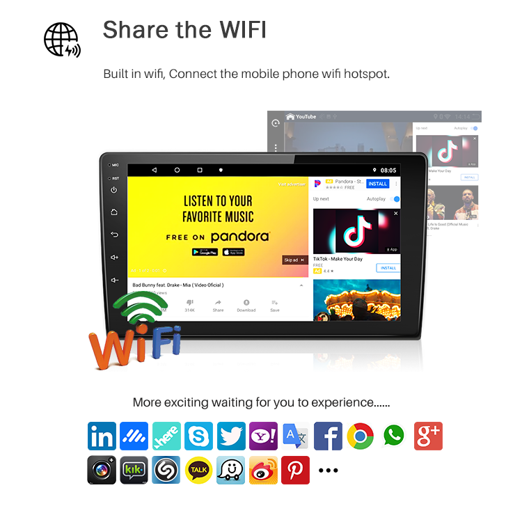 GPS, Estéreo, DSP, CarPlay, Enlace espejo, Android auto, Imagen en la imagen, Micrófono incorporado, Pantalla dividida, Administrador de archivos, Coche de Control de volanteFunción