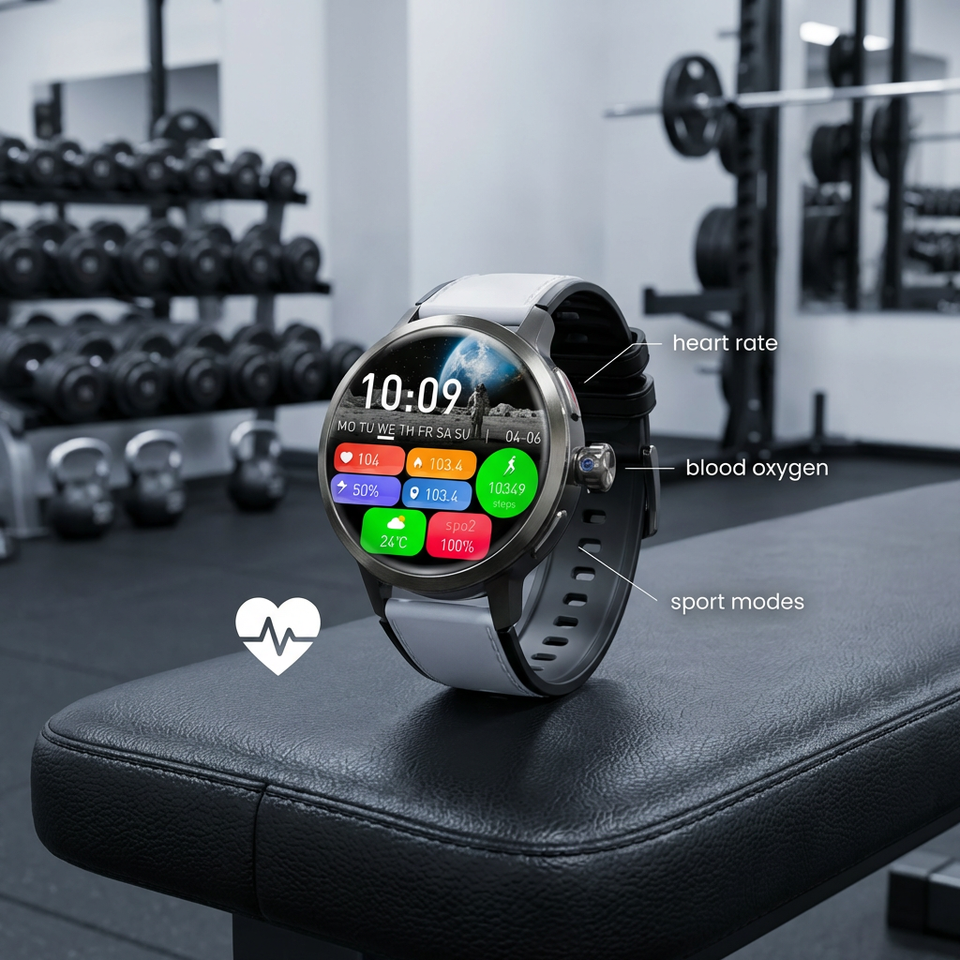 Función:Asistente de voz AI, Acelerómetro, Seguimiento de la actividad, Reloj despertador, Respuesta telefónica, Monitor de respiración, Calculadoras, Calendario, Recordatorio de llamada, Rastreador de calorías, Marcar llamada, Rastreador de distancia, Correo electrónico, seguimiento de forma, Navegacion GPS, Monitor de ritmo cardíaco, Recordatorio de mensajes, Rastreador multideporte, Reproductor DE MÚSICA, Podómetro, Recordatorio sedentario, Rastreador de sueño, Notificaciones de Medios sociales, Videollamada, Llamada de voz, Hora mundial