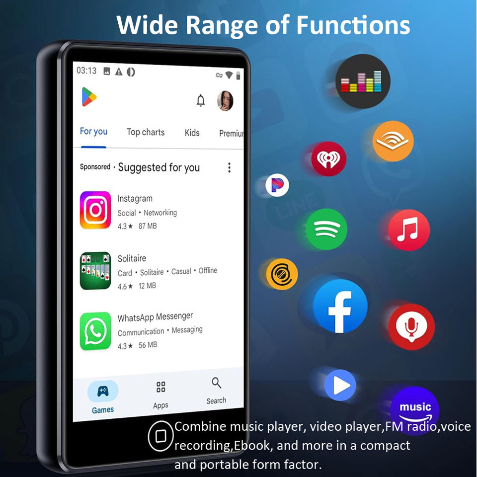 Reproductor MP3 Android WiFi con Google Play Store, Pantalla Táctil de 4.0 Pulgadas, Reproductor de Música Spotify y YouTube, Bluetooth 5.0, Walkman OEM 2026