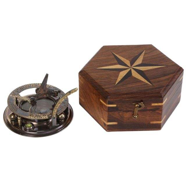 Nombre:Brújula de reloj de sol de latón con caja de madera