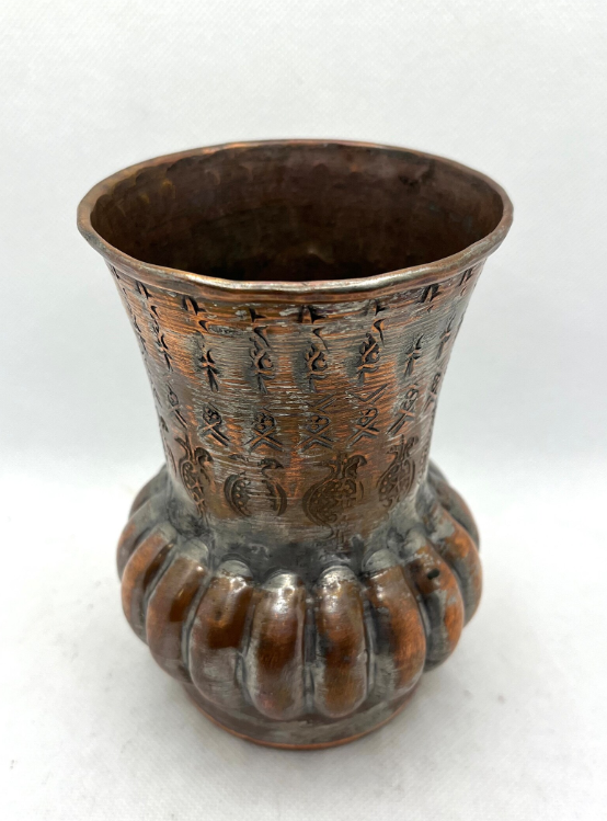 Florero cónico de cobre antiguo, diseño rústico acanalado, detalles ornamentales de aluminio grabados a mano para mesa de bodas