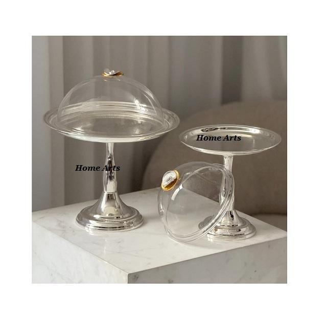 Soporte de pastel de forma redonda de diseño antiguo con cúpula de vidrio Soporte de servidor de chocolates de color plateado de acero inoxidable con cúpula