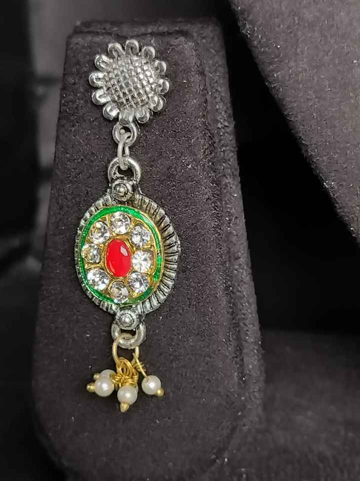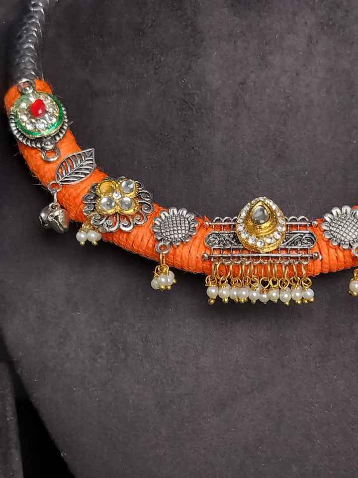 Material:Oxidized alloy, silk thread, faux pearls, glass stones