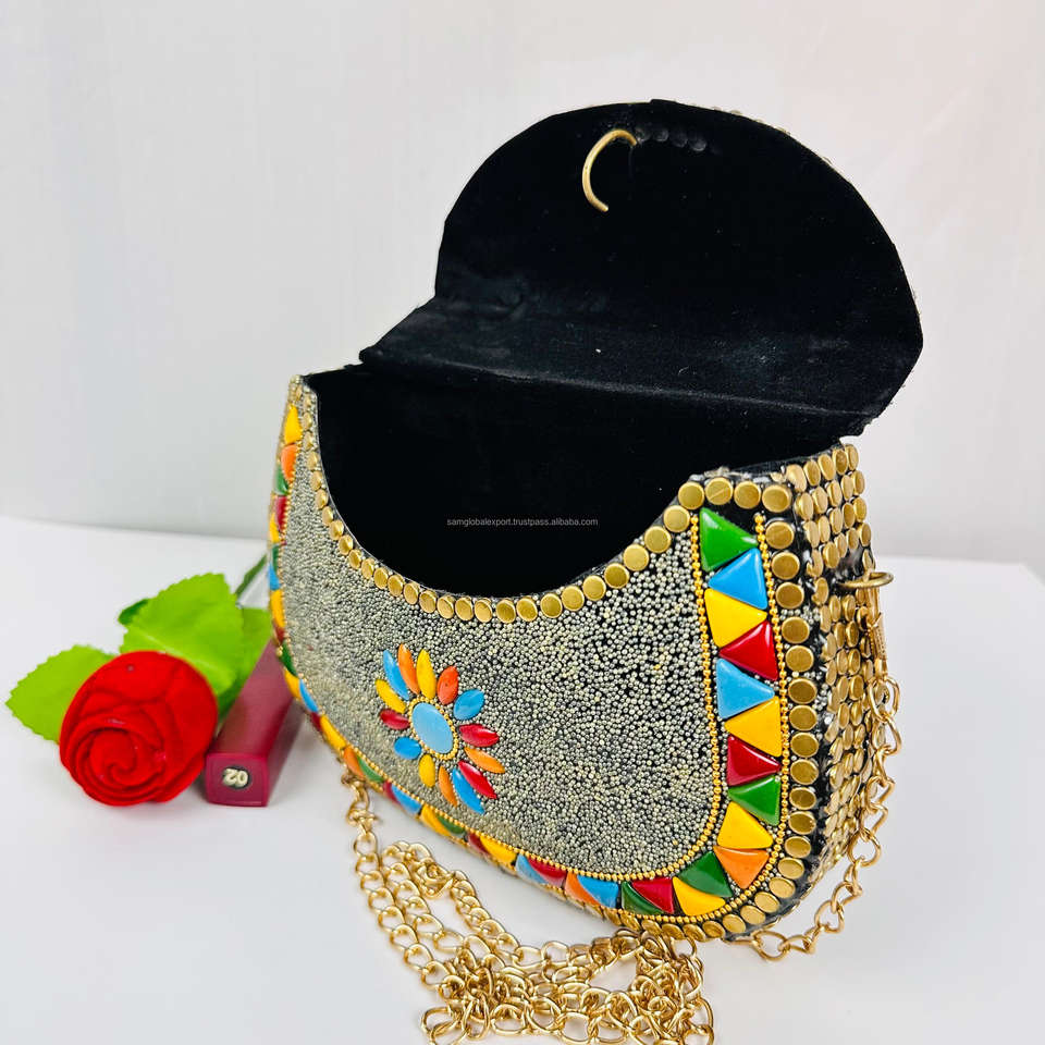 Bolso de Mano Estilo Vintage con Mosaico de Piedras y Escultura de Aluminio Pulido Chapado en Oro Antiguo Moderno, Bolso de Fiesta para Mujer con Pedrería