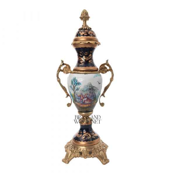 Jarrón Antiguo de Porcelana y Latón con Arte Escénico Pintado a Mano, Asas Ornamentales y Base Dorada Decorativa para Interiores de Lujo