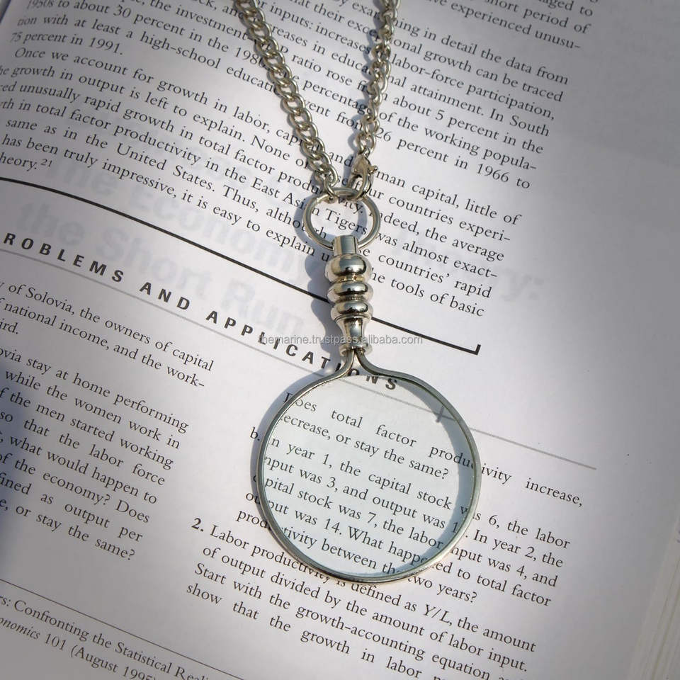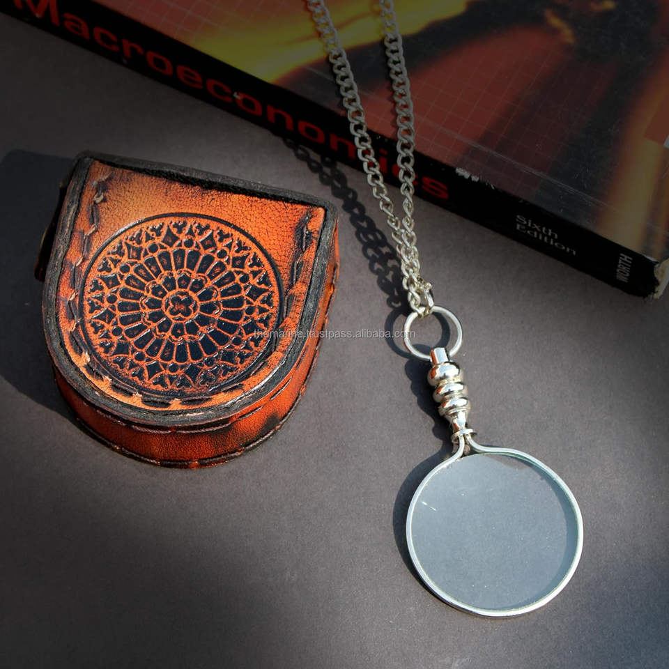 Collar de lupa con acabado plateado de estilo antiguo, colgante de lente de lupa óptica con cadena de latón y Funda de cuero