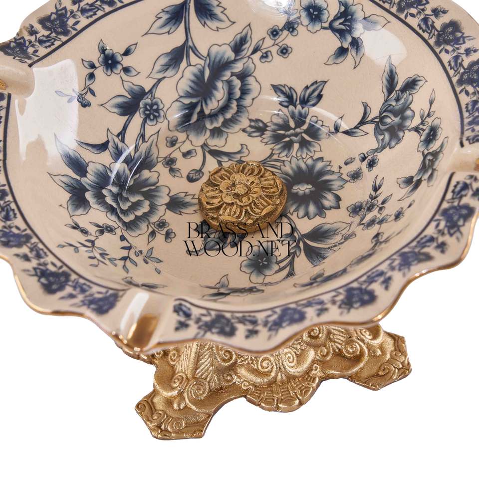 Plato decorativo de latón antiguo cuerpo de porcelana con diseño floral azul base adornada dorada centro de mesa hecho a mano de lujo